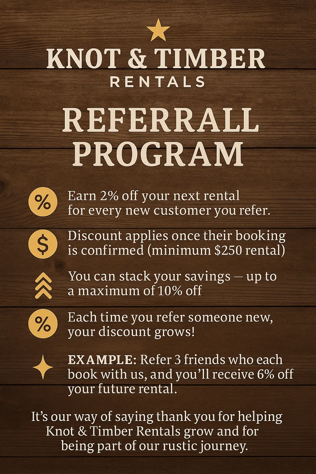 It’s our way of saying thank you for helping Knot & Timber Rentals grow and for being part of our rustic journey.